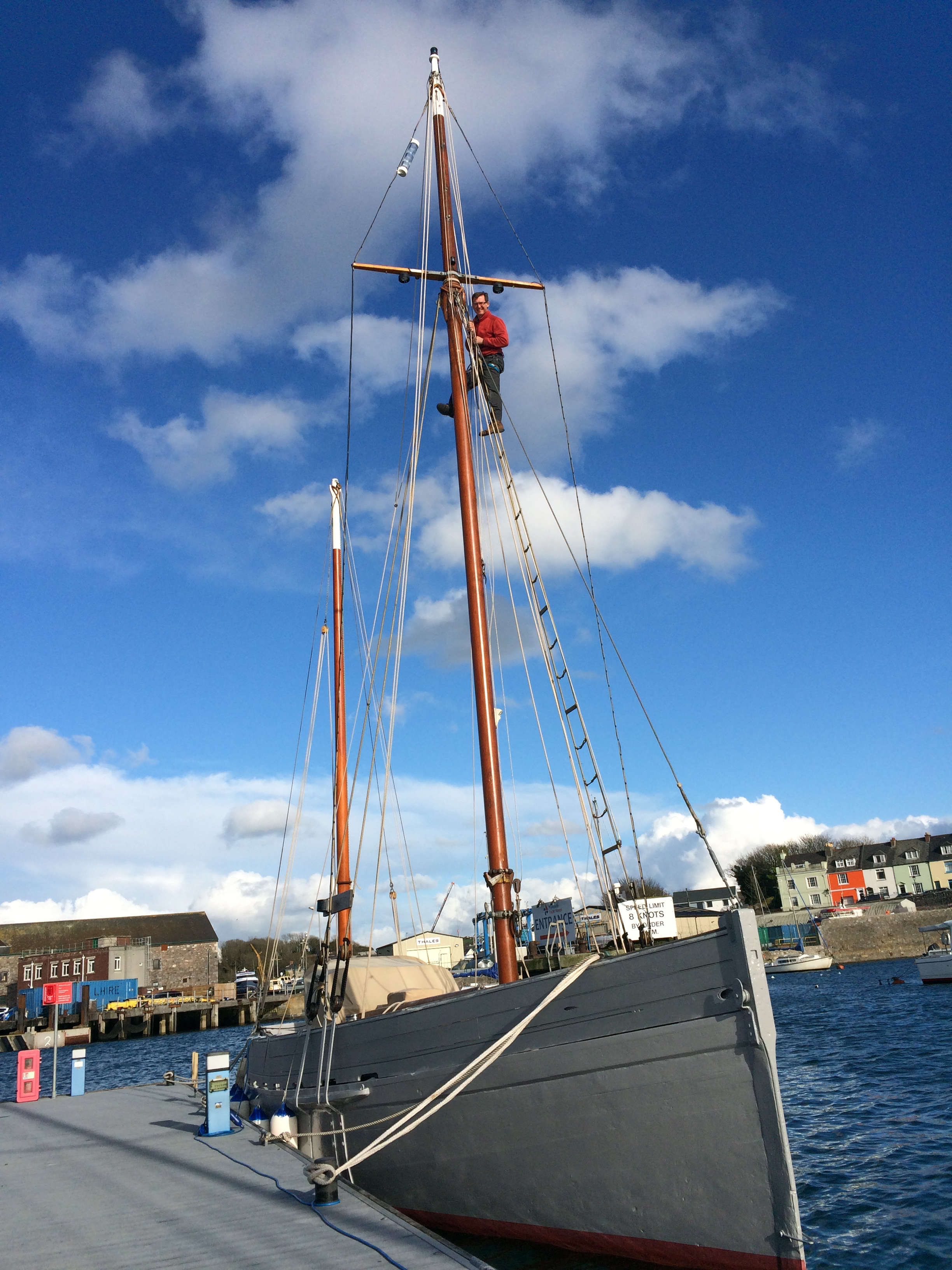Paul up the mast. Photo by Celia